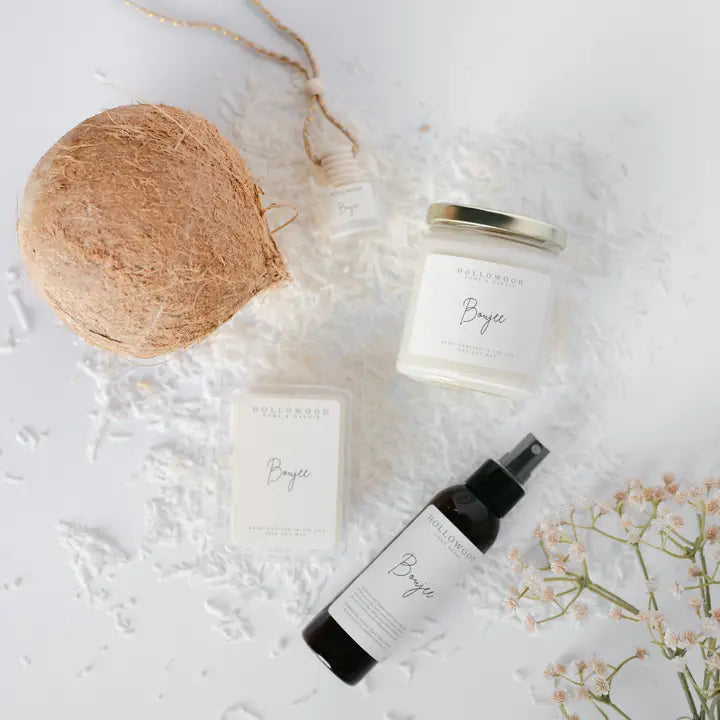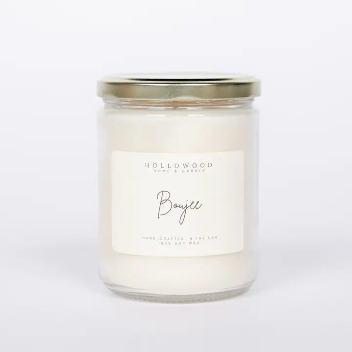 Indulge in the luxurious and refreshing scent of BOUJEE. A perfect blend of fresh flowers, light coconut, and soothing musk and sandalwood will transport you to a tropical paradise. Elevate your senses with this invigorating fragrance  540. Wax: 100% Soy | Vegan | Non-GMO Wick: 100% Cotton | Lead and Zinc Free Oil: Premium Fragrance Oil Made in the USA Poured in Griffin, Ga To prevent fire and serious injury: Always trim wick to 1/4 inch before lighting and keep debris out of the wax pool. Never burn longer than 2-hour intervals. Set the candle on a heat-resistant surface and avoid drafts. Always burn within sight and extinguish before leaving the room. Don’t burn near things that catch fire. Keep away from children and pets. Don’t extinguish with water. Always let the wax harden before relighting, touching, or moving.