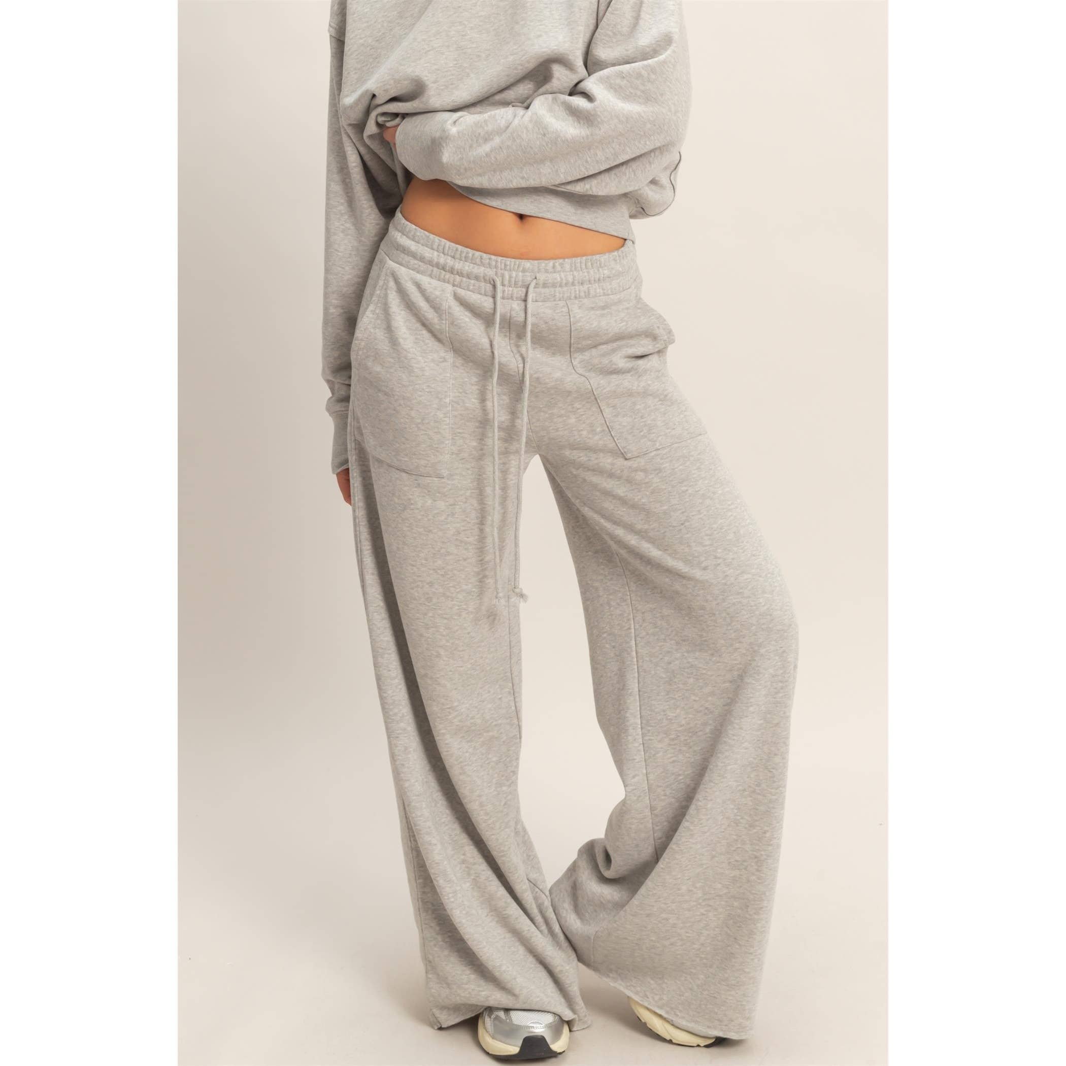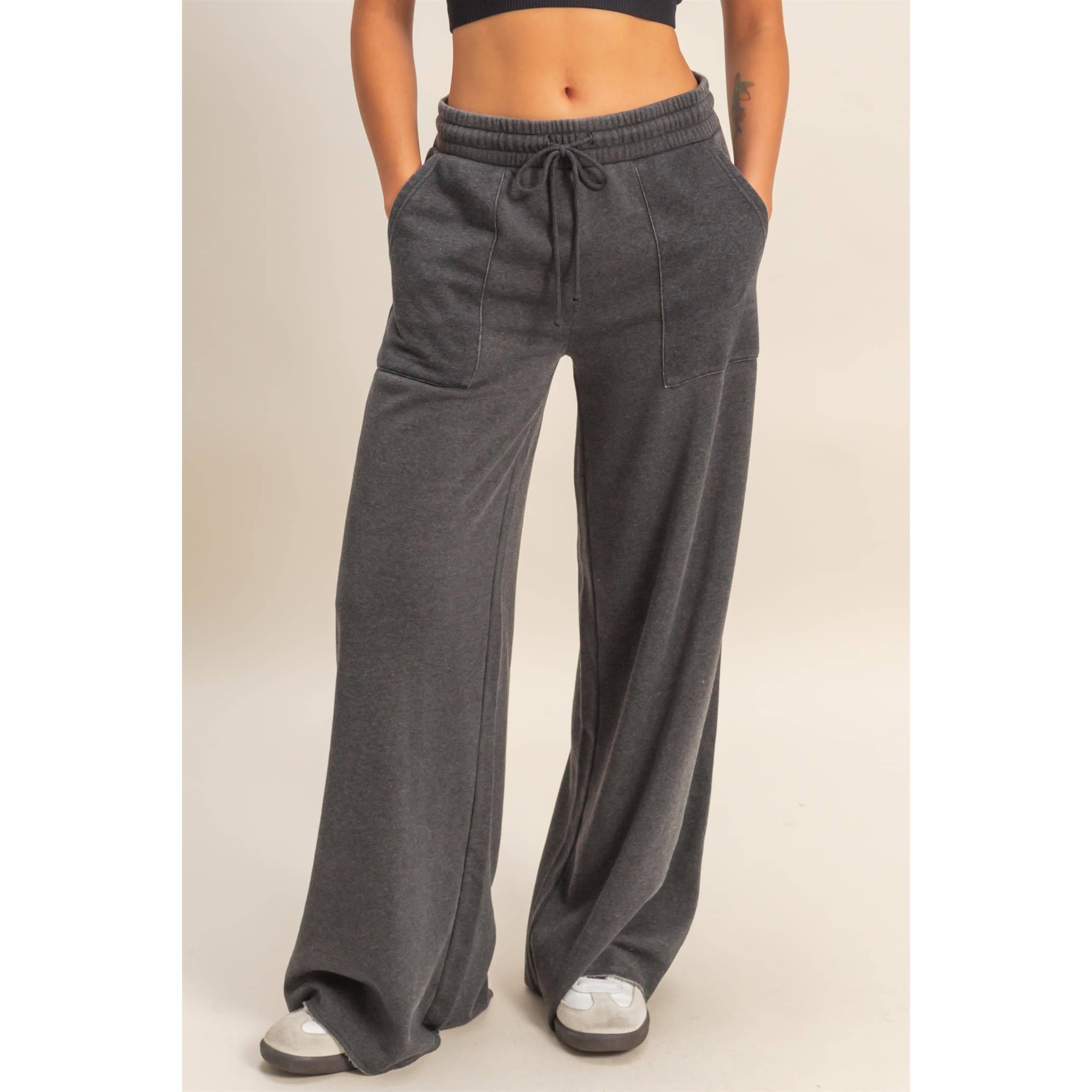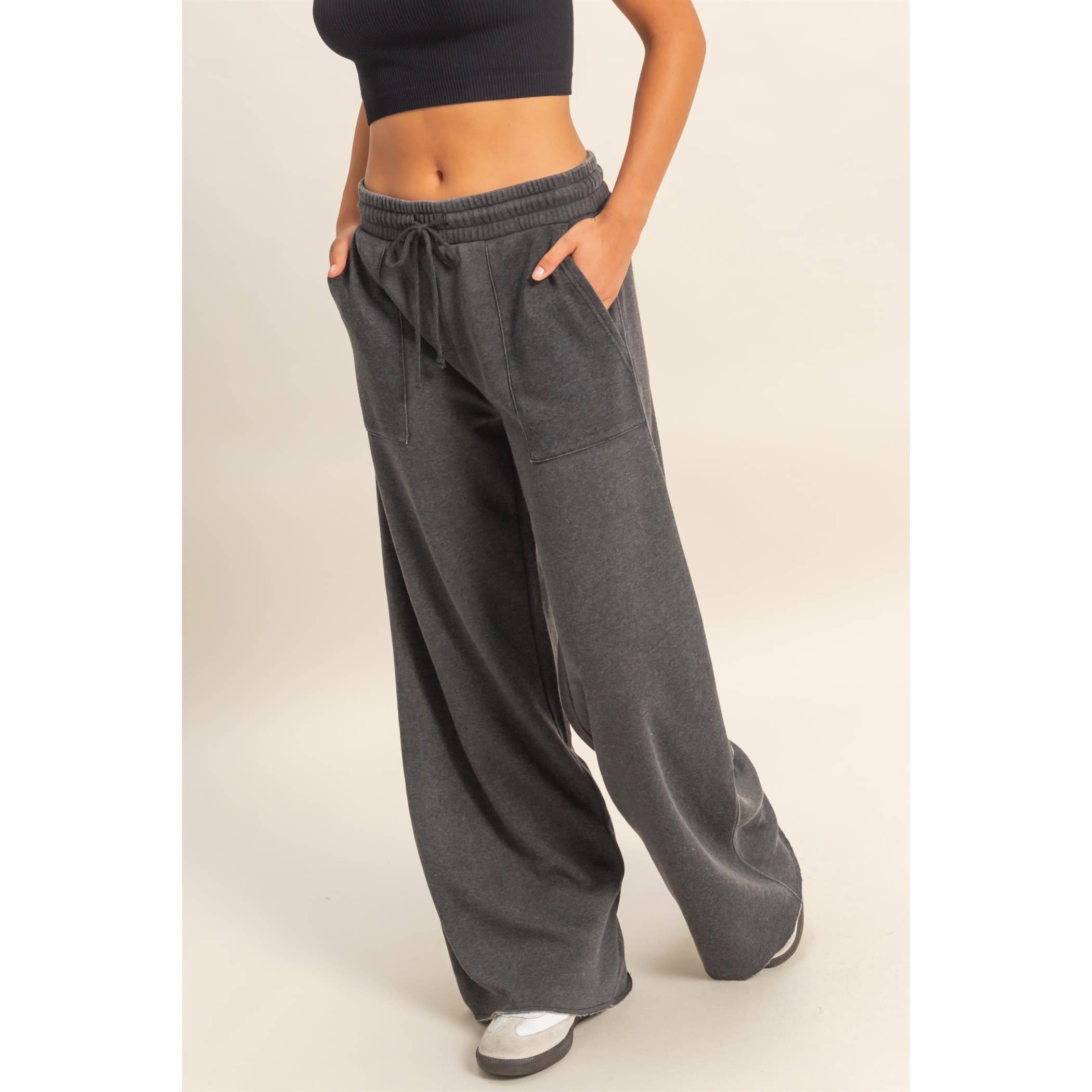 These contemporary pants are crafted from soft burnout washed french terry, featuring a flattering high-rise elastic waistband with a functional drawstring tie. The cut is a dramatic oversized wide-leg silhouette with prominent front-facing patch pockets. Pair with a cropped sweatshirt and chunky sneakers for a cozy, yet chic look. 51% Cotton 49% Polyester