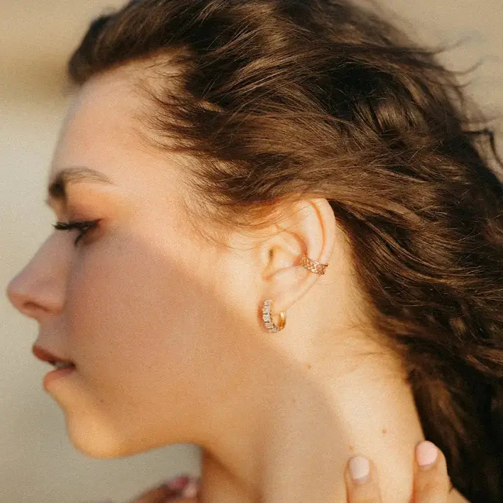 These Charlotte Diamond Hoops are dainty, high quality, and hypoallergenic. They are tarnish and wear resistant and made of long lasting 18k gold fill. Inner diameter is 12mm and outer is 16mm.