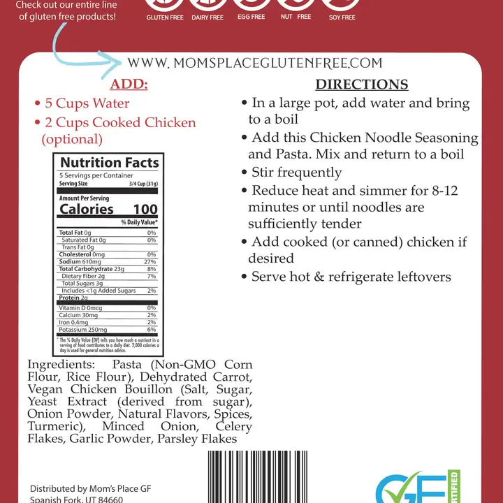 Mom’s Place Gluten-Free Chicken Noodle Soup Mix offers a hearty, comforting classic made with a rich chicken broth base, a flavorful blend of vegetables and spices, and premium gluten-free IsiBisi elbow pasta. This easy-to-prepare mix is perfect for retail, foodservice, or meal kits—delivering a satisfying, allergen-friendly option for any day of the week. Ideal for quick meals, grab-and-go offerings, or a warm addition to your seasonal menu lineup. Makes approximately 5 servings. * SAFETY & QUALITY: Mom’s Place Gluten-Free products are manufactured on dedicated gluten-free and nut-free equipment in Utah, USA. We are committed to providing the safest, highest quality, and best tasting food available. * GREAT TASTING: Try Mom’s Place Gluten-Free Chicken Noodle Soup Mix and enjoy a hearty, warm meal without sacrificing taste or flavor. * HOMEMADE: Create memories as you make homemade, delicious gluten-free food that the whole family will love.