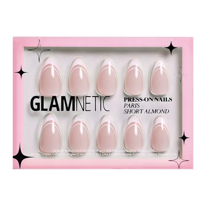 Capture the French-girl allure with Glamnetic's Paris Press-On Nails Set. Featuring a trend-driven French tip design, this subtle twist on a classic look is perfect for dressing up or down. From your morning café visit to an evening stroll, this short almond nail will elevate your mani game. 𝐊𝐞𝐲 𝐅𝐞𝐚𝐭𝐮𝐫𝐞𝐬 • Length: Short • Shape: Almond • Finish: Glossy • Opacity: Semi-Transparent • Thickness: 0.6mm • Reusable, each wear lasts up to 2 weeks • Waterproof • Customizable • Vegan & Cruelty-free