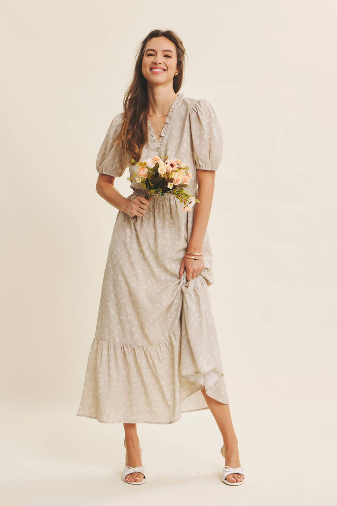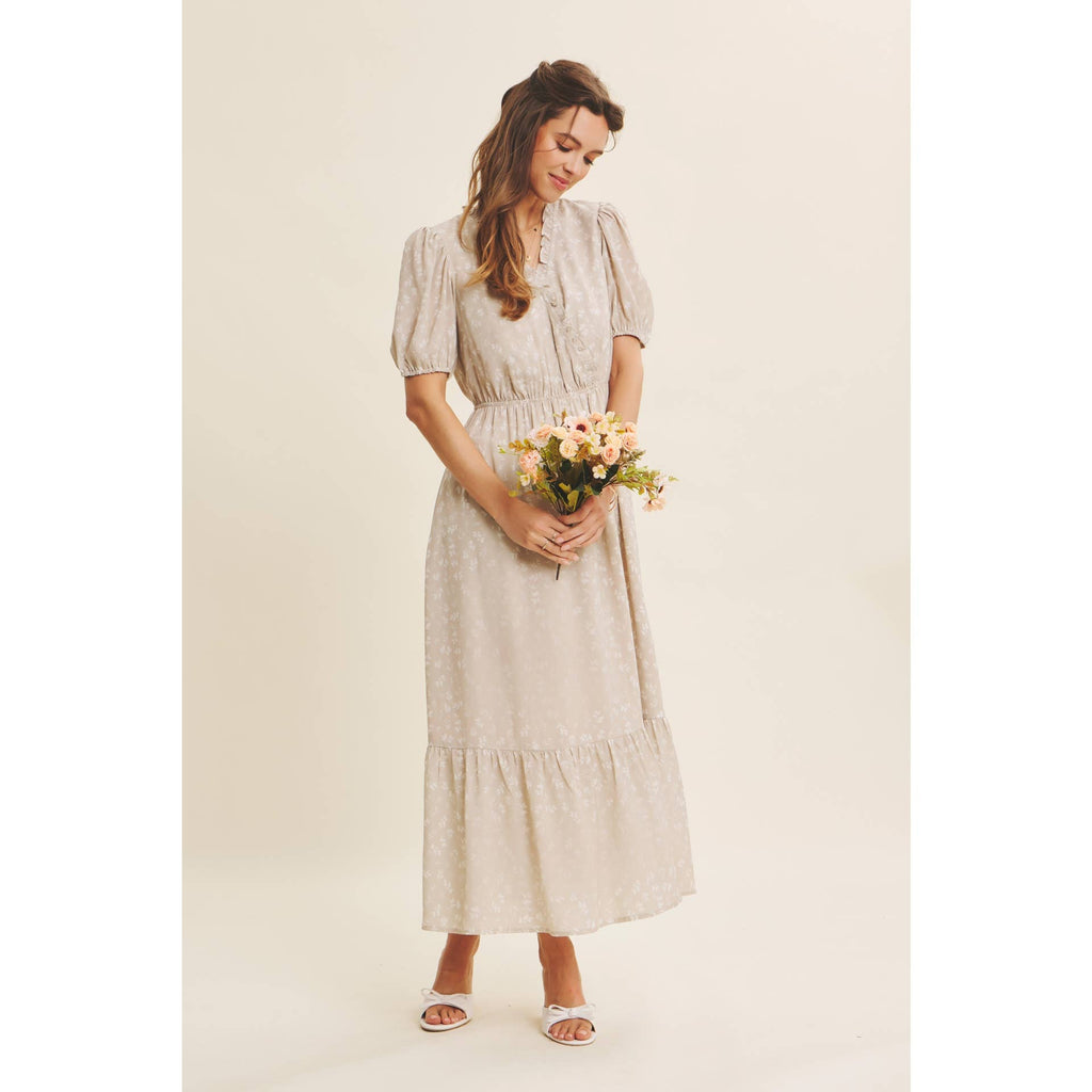 DAINTY FLORAL WRAP MAXI DRESS WITH RUFFLES & PUFF SLEEVES