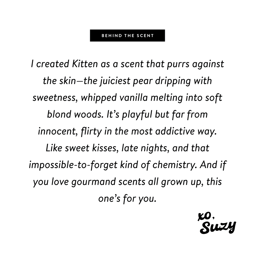 For vanilla lovers who purr at the thought of something soft with an edge. Kitten is cozy, flirty, and quietly magnetic — juicy pear and whipped vanilla curl into light blonde woods and a touch of silken musk. It’s the perfume that stretches out lazily in the sun by day and arches its back with come-hither mystery by night. Cozy, adorable perfection.