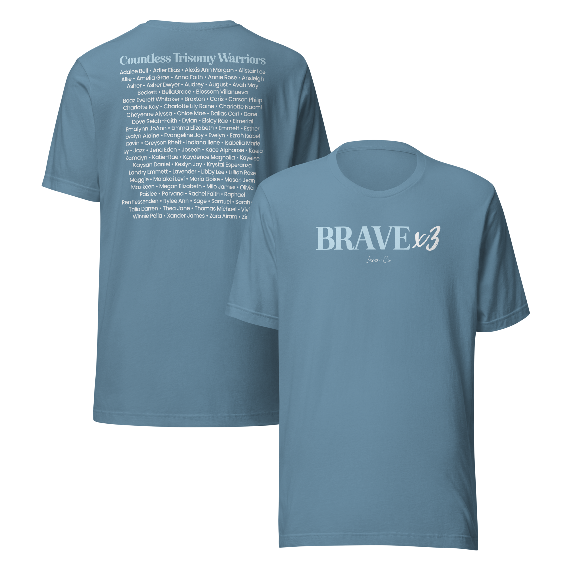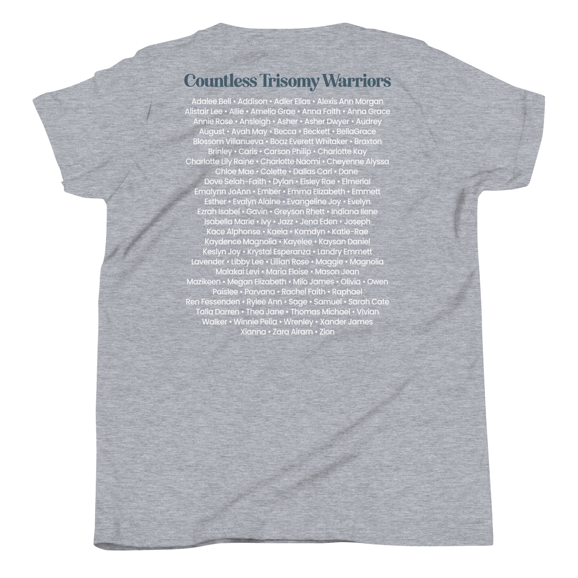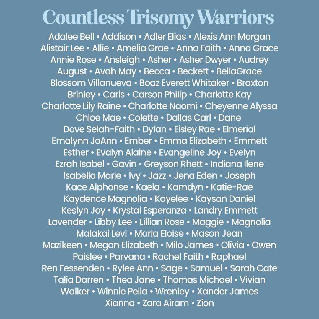 Trisomy is often given statistics and limits. Our warriors are more than a statistic. They are fighters, joy givers, and world changers in their own way. This shirt gives you the opportunity to carry their names with you and start conversations that matter.