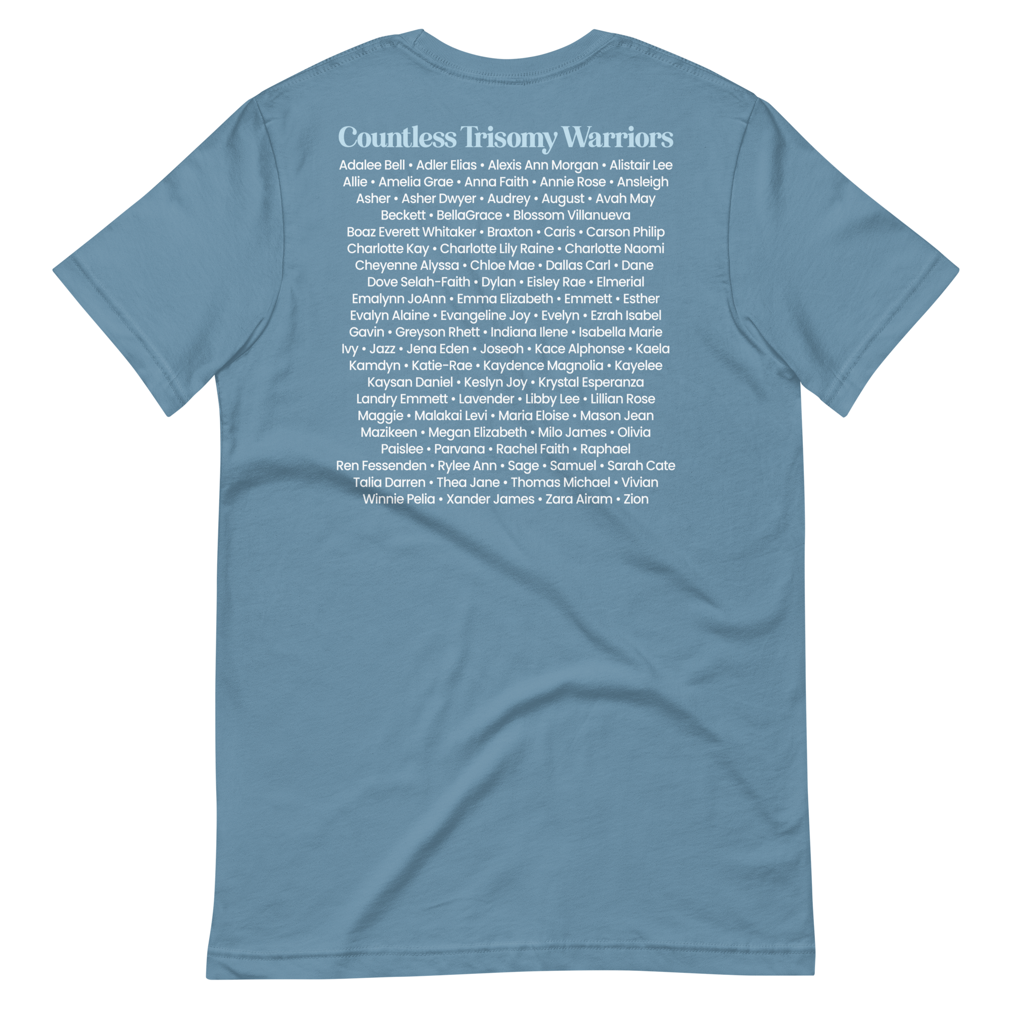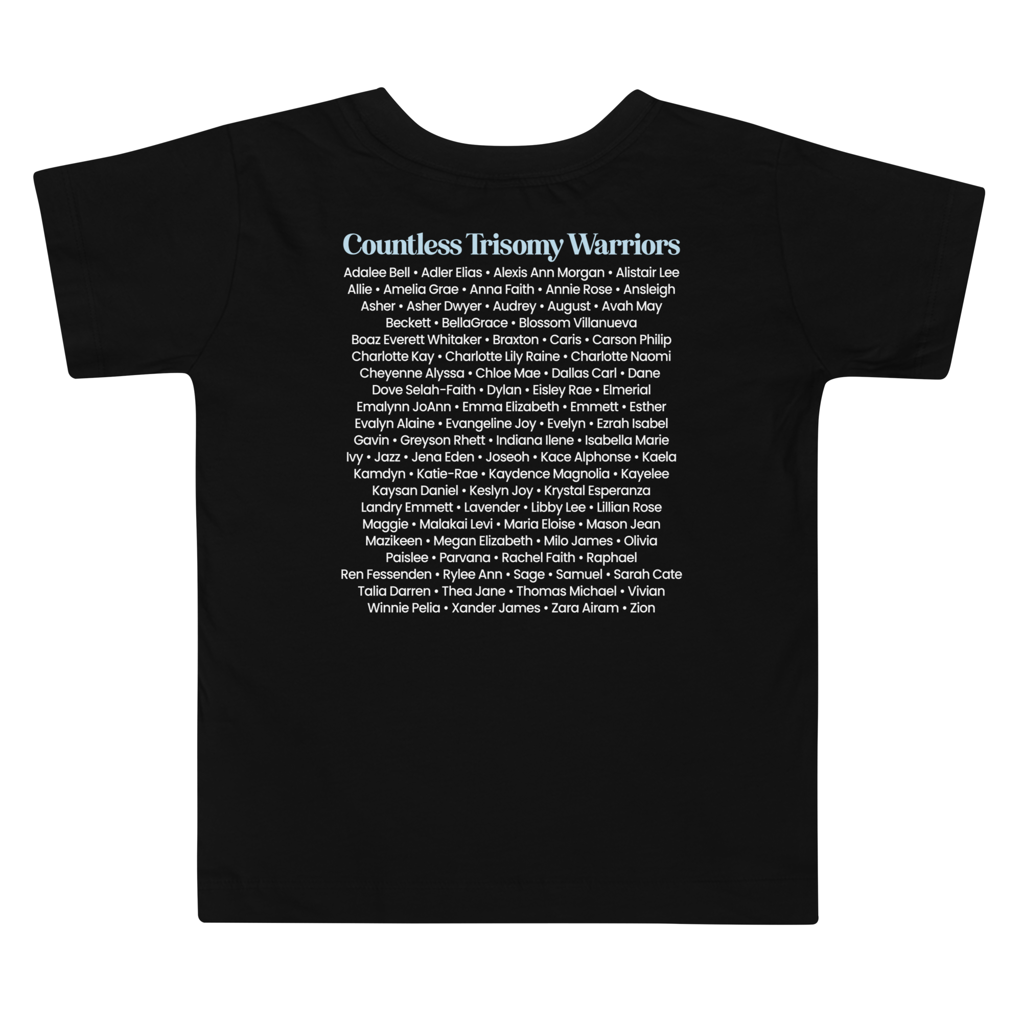 This tee was designed to make their stories visible. Each name printed on the back represents a real warrior, a real family, and a life that matters. When you wear it, you are helping bring awareness to Trisomy and reminding the world that these children are seen, valued, and deeply loved.