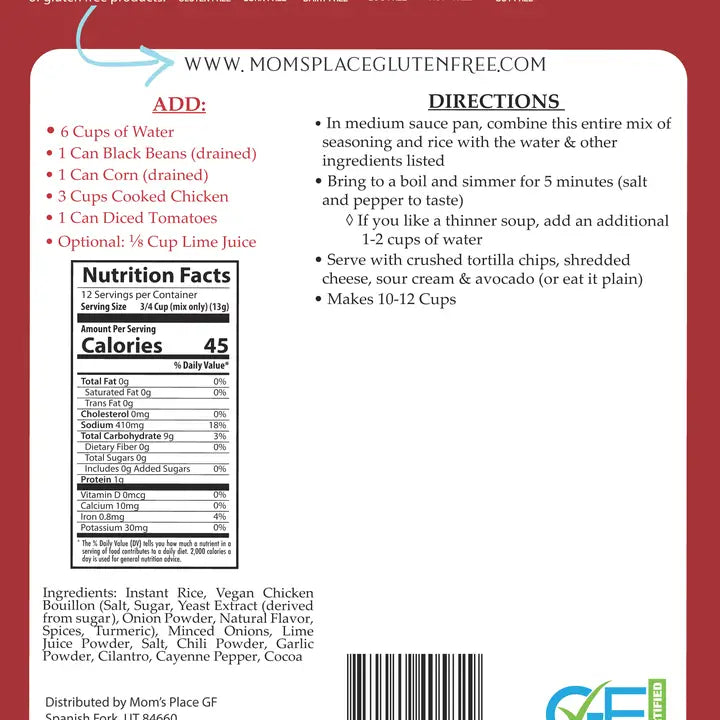 Mom’s Place Gluten-Free Chicken Tortilla Soup Mix delivers a hearty, comforting, and flavorful meal solution—perfect for retail, foodservice, or prepared meal kits. Featuring a rich chicken broth base and a blend of warm, Mexican-inspired spices, this mix pairs perfectly with black beans, corn, diced tomatoes, and shredded chicken. Top with sour cream, shredded cheese, avocado, cilantro, lime juice, and tortilla strips for a delicious, fully customizable dish that’s easy to prepare and packed with flavor. Makes 10-12 cups. * SAFETY & QUALITY: Mom’s Place Gluten-Free owns and operates its own manufacturing facility located in Spanish Fork, Utah. We are a dedicated nut-free and gluten-free facility committed to providing the highest quality and best tasting food available. * GREAT TASTING: Try Mom’s Place Gluten-Free Chicken Tortilla Soup Mix and enjoy a hearty, warm meal without sacrificing taste or flavor.