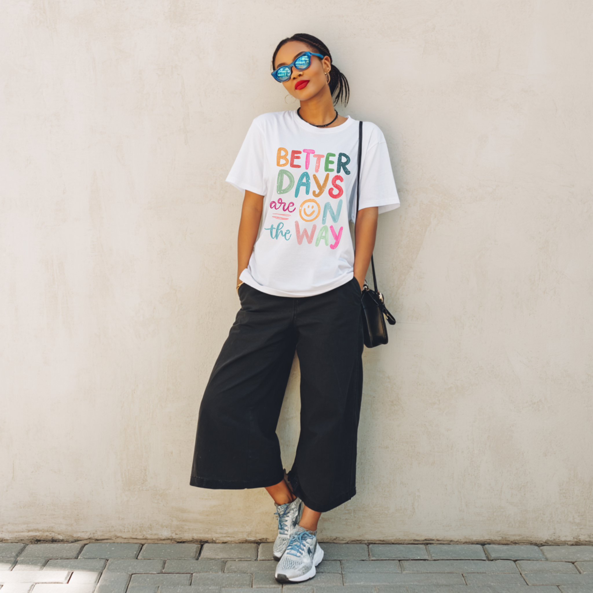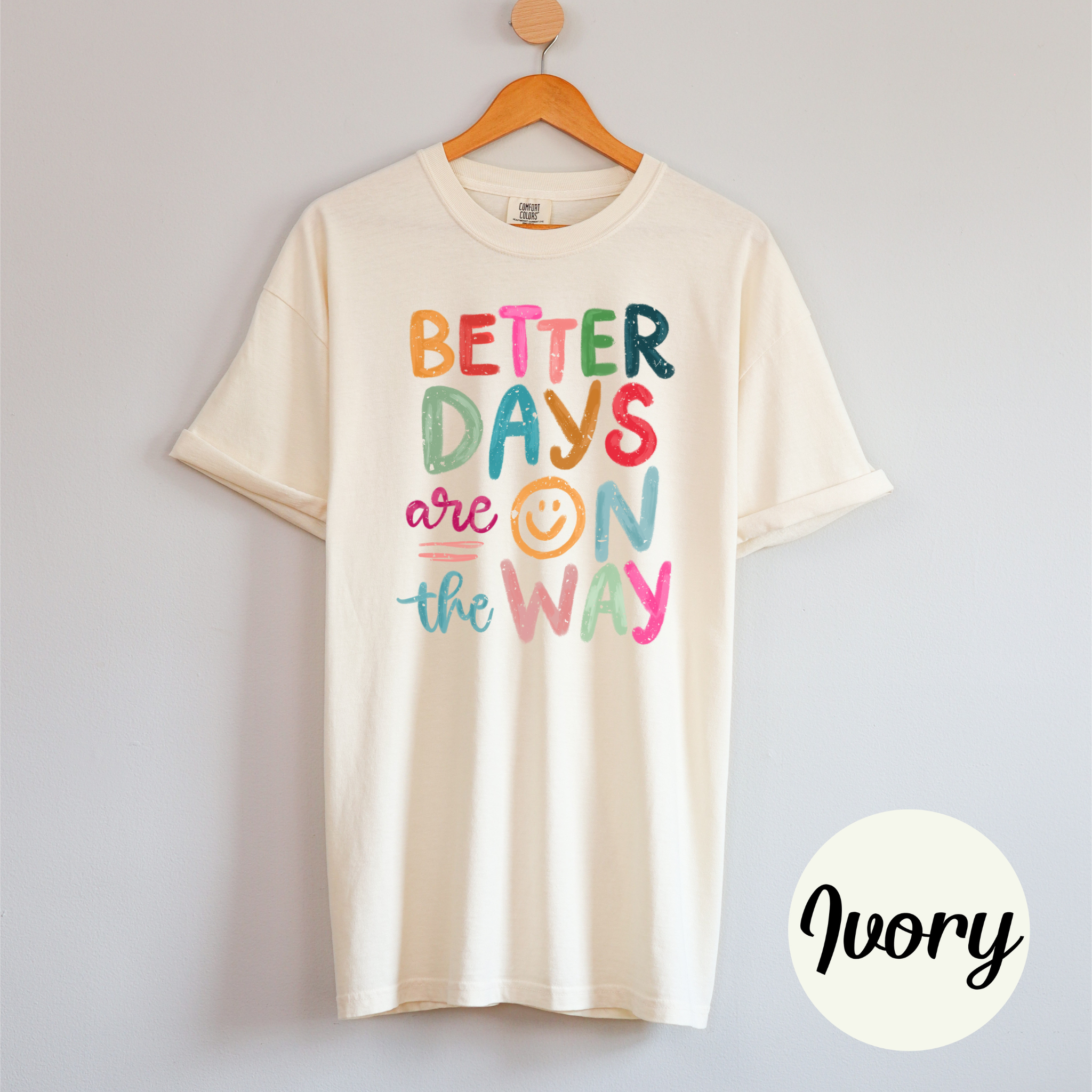 Brighten your wardrobe with the Better Days Tee Shirt, featuring a cheerful smiley face cleverly placed in the "O" of the uplifting message. Its colorful design not only adds a pop of joy to any outfit but also serves as a daily reminder that better days are ahead. Perfect for spreading positivity wherever you go.