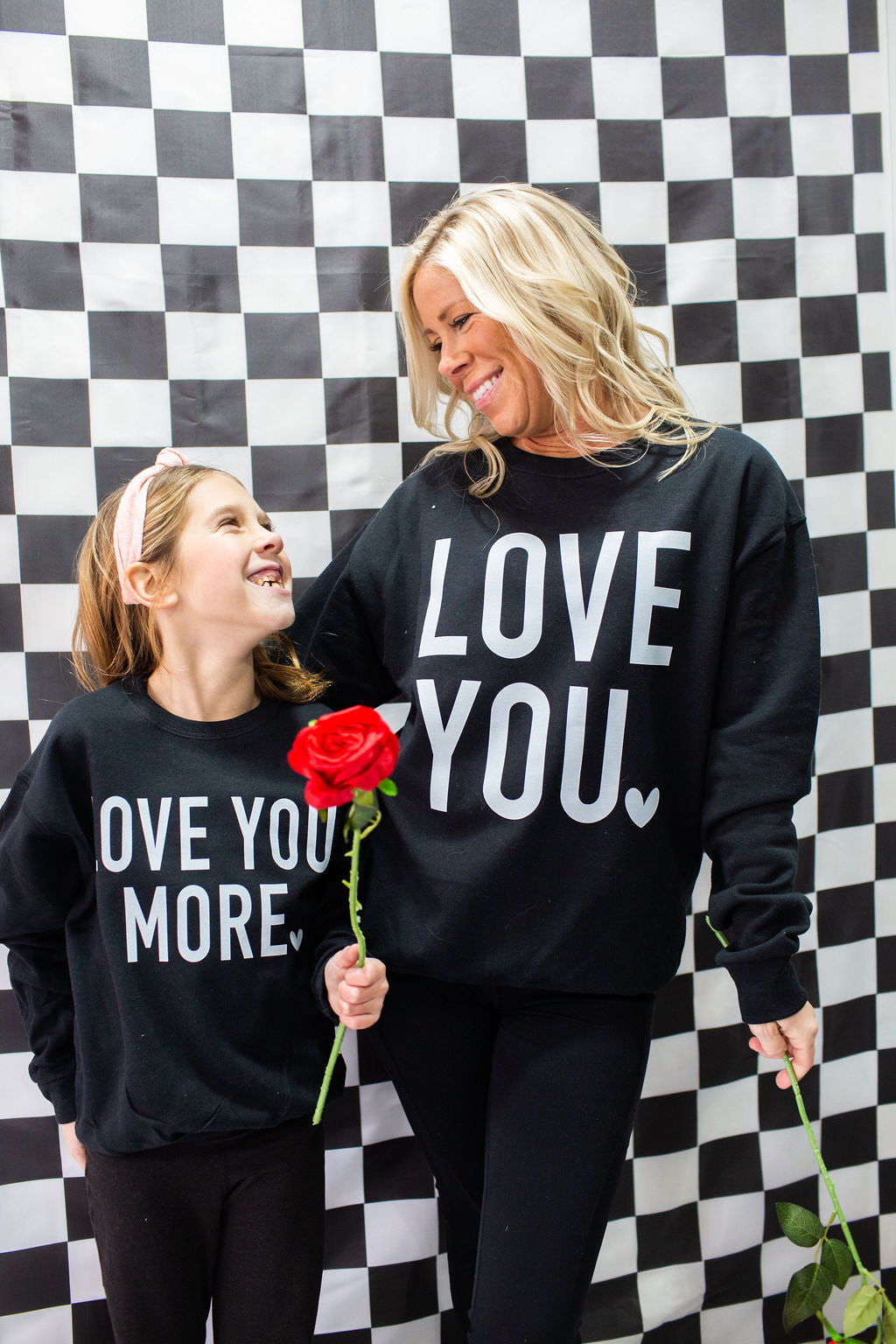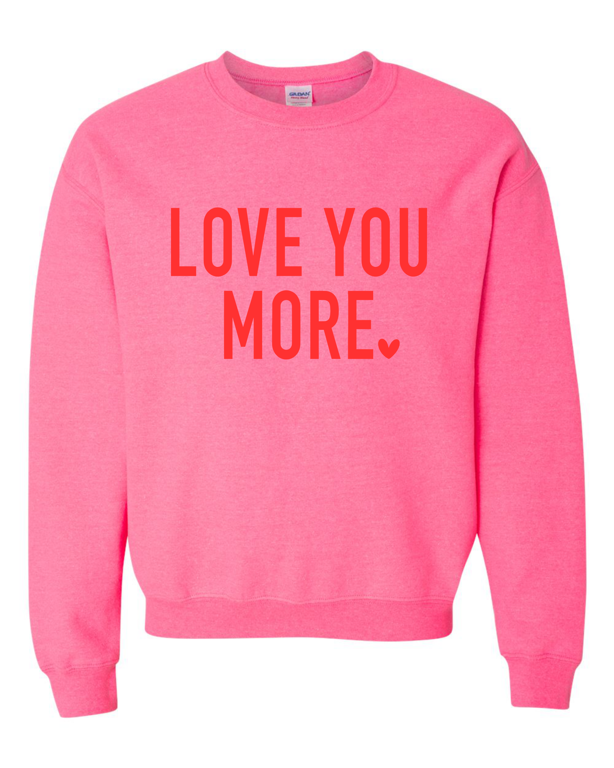 LOVE YOU MORE (love you sweatshirt not included)White :Youth College Crewneck Sweatshirt 80% ringspun cotton / 20% polyesterUnisex fitBlack :Jerzees NuBlend Youth Crewneck Sweatshirt 50/50 cotton/polyesterUnisex fitSafety Pink :Gildan HeavyBlend Crewneck Youth Sweatshirt 50/50 cotton/polyesterUnisex fit