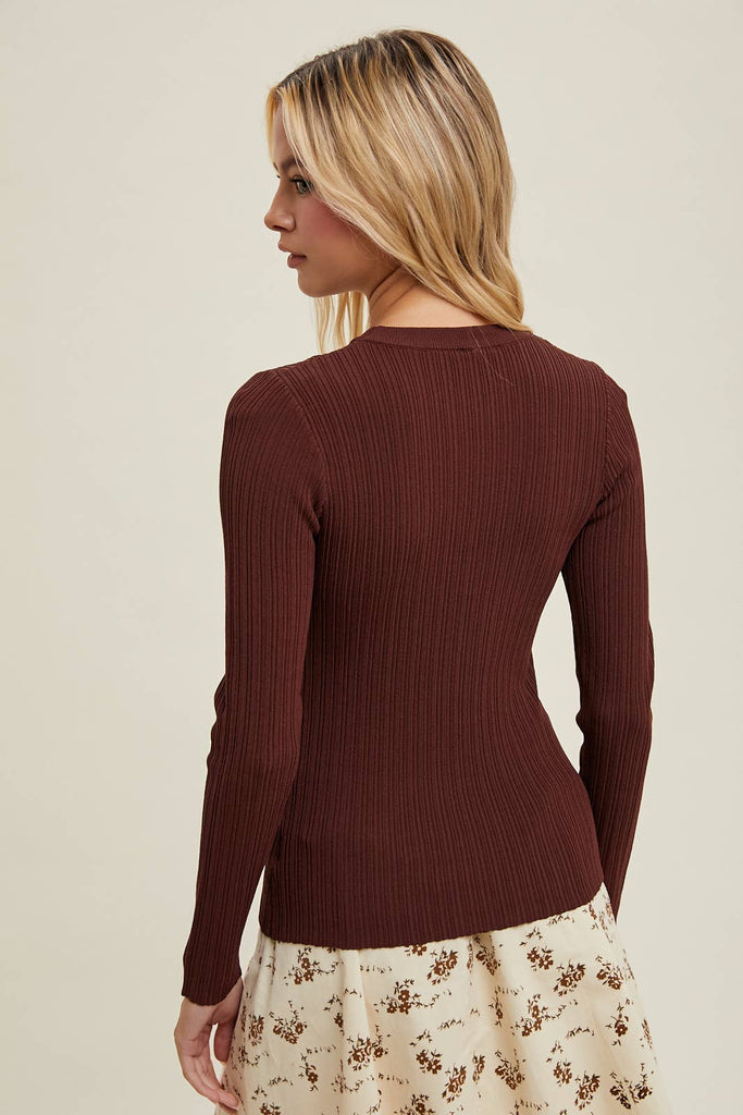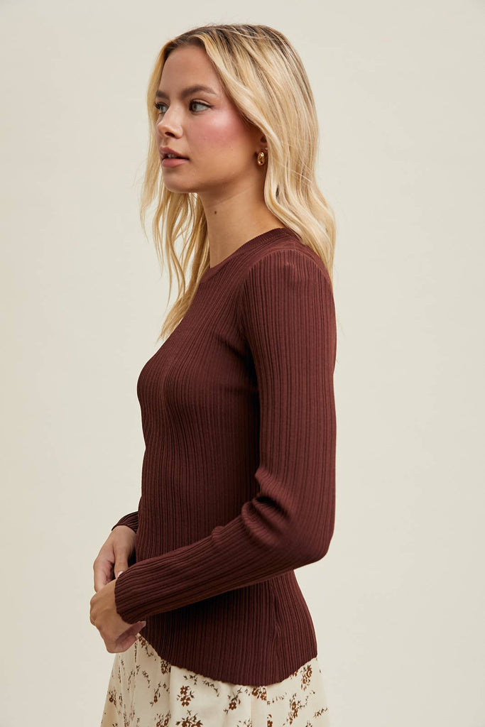 RIBBED TEXTURED FITTED KNIT TOP - ROUND NECK, LONG SLEEVE, COMFORTABLE, CASUAL 65% VISCOSE, 35% NYLON * Due to lighting and differences in monitors, actual colors may vary slightly from what appears online.