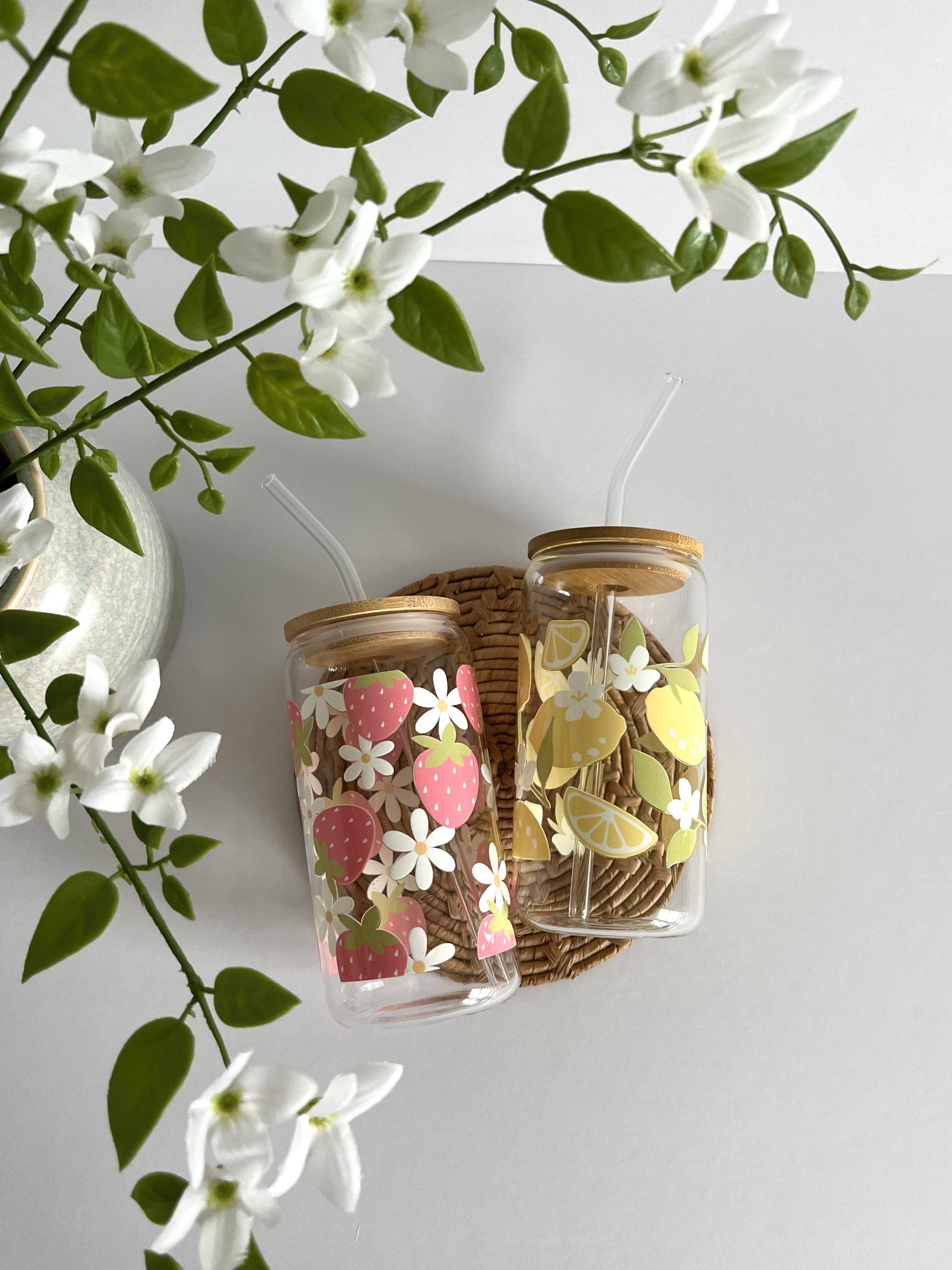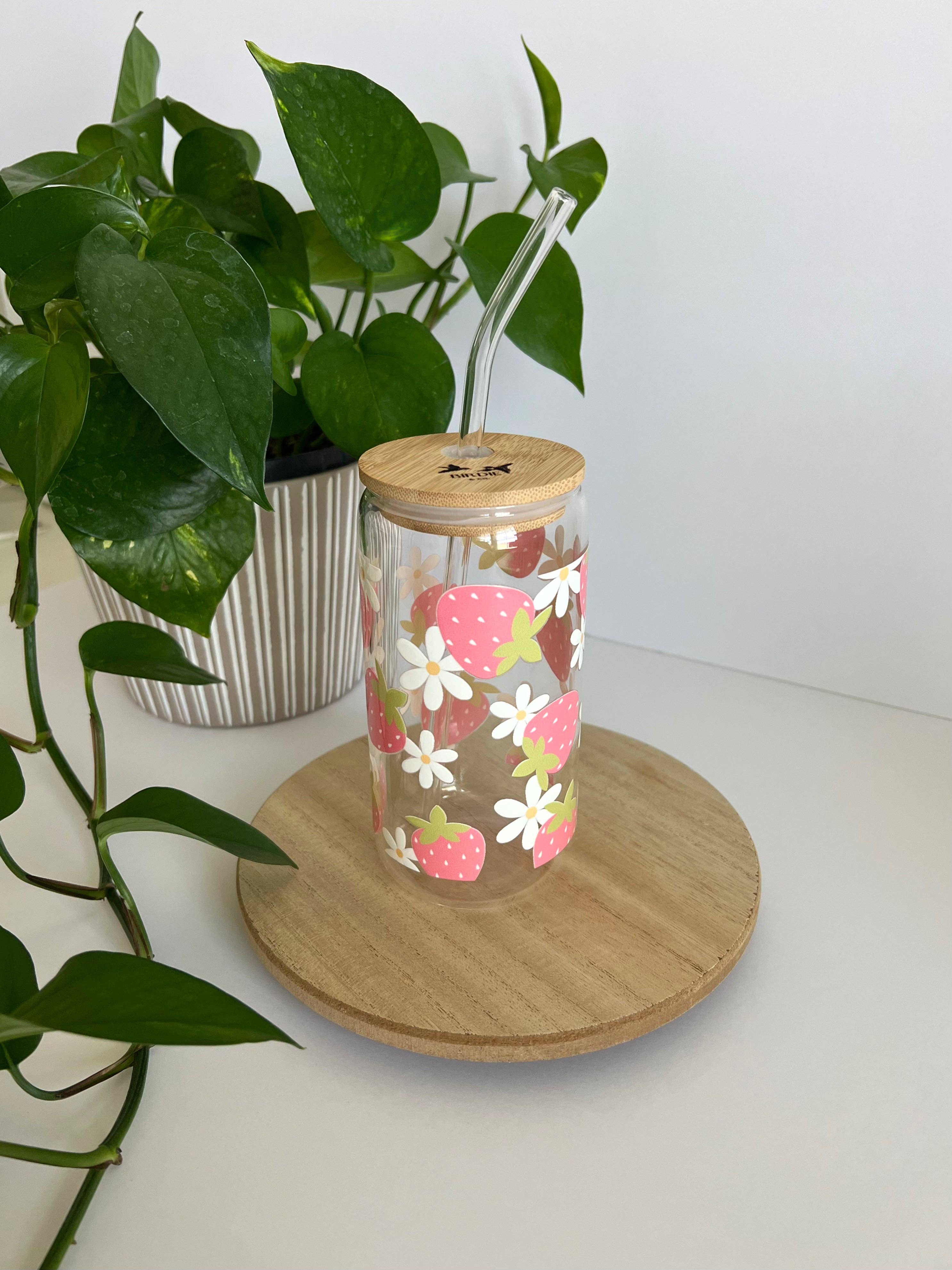 Refresh your glassware collection with this Strawberry Can Glass, featuring a playful summer strawberry & daisy design. Perfect for sipping on a sunny day. Cheers!