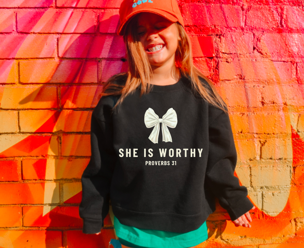 She Is Worthy Coquette Bow Sweatshirt Faith Youth Crewneck