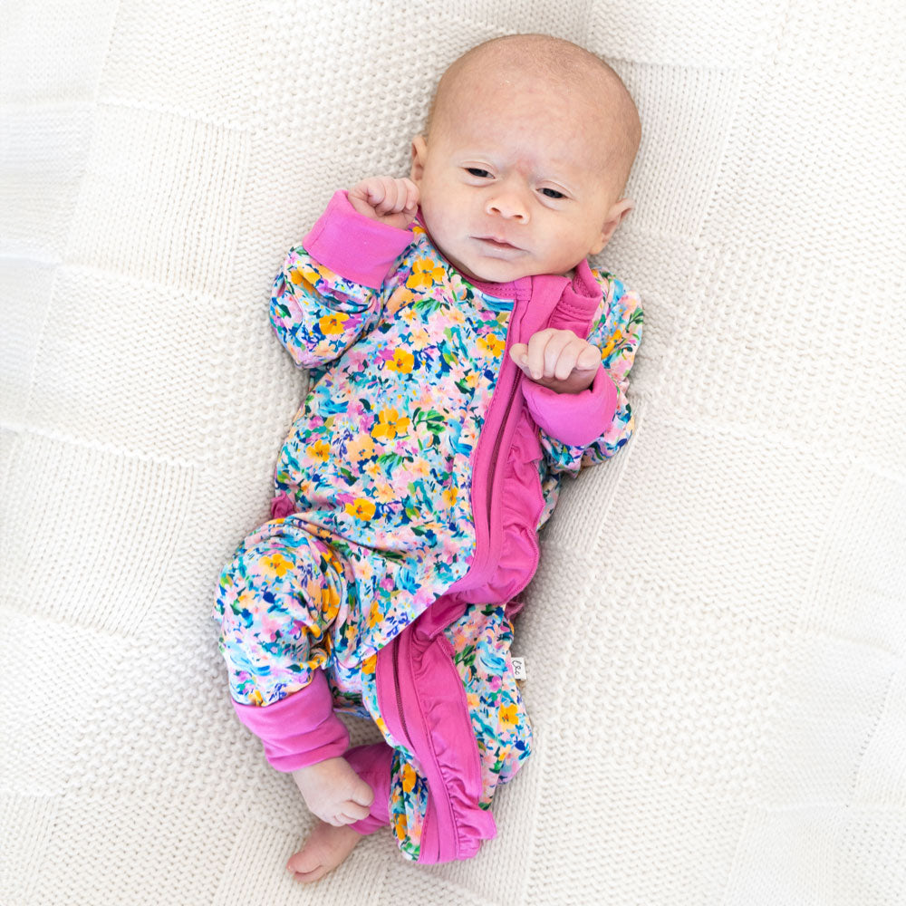 Laree + Co.'s luxuriously soft ruffle bamboo one-piece convertible footie with three-way zippers is a game changer. They make diaper changes a breeze and are also perfect for our little warriors with tubes and wires!