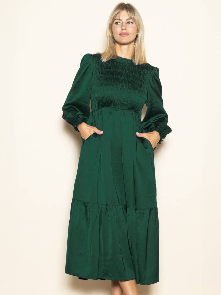 Smocked Chest Mock Neck Long Sleeve Satin Dress with Pockets