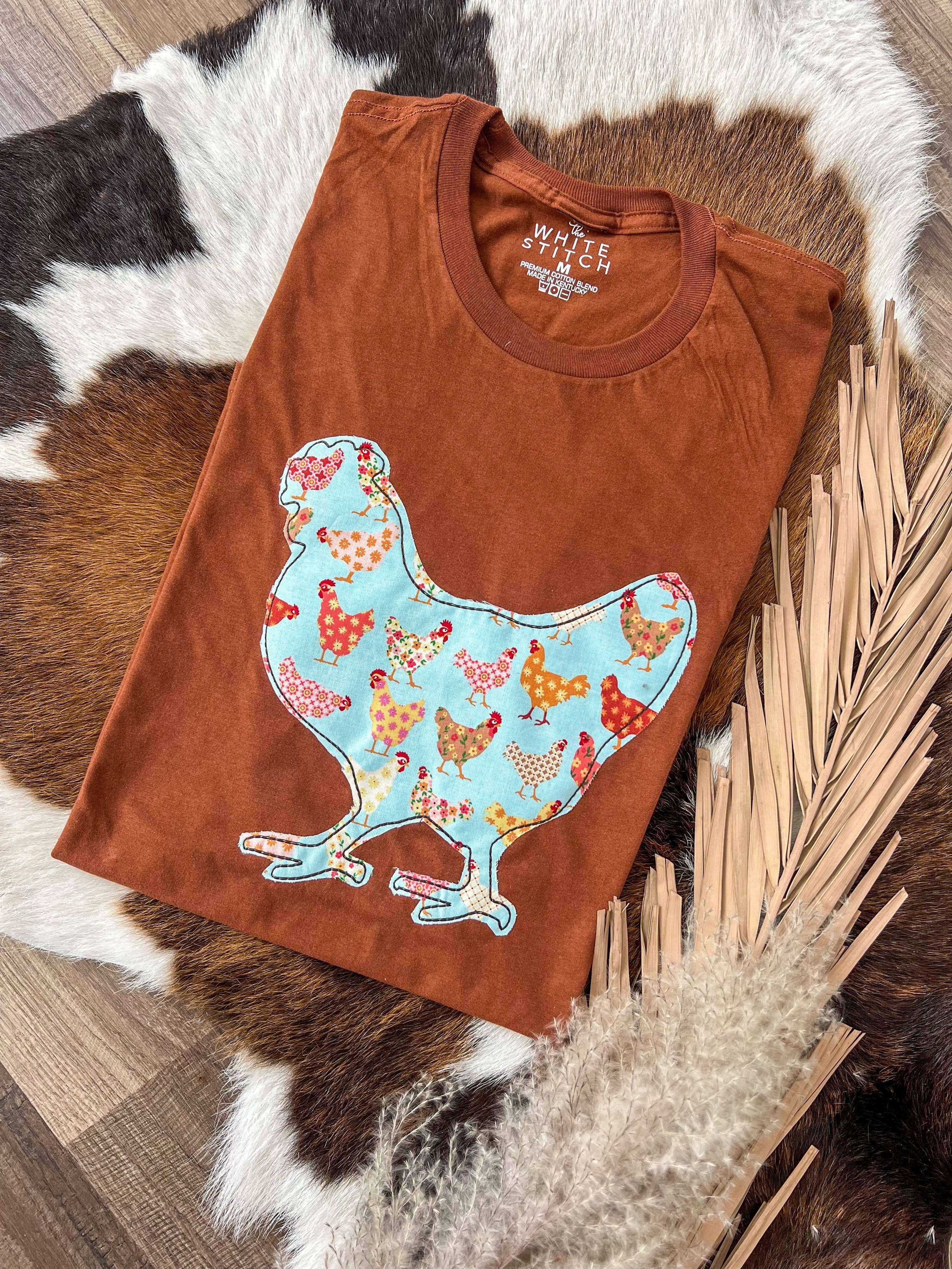 Handmade with love, our Chicken coop tee is made with hand cut applique fabric sewn onto a soft tee made from US cotton.
