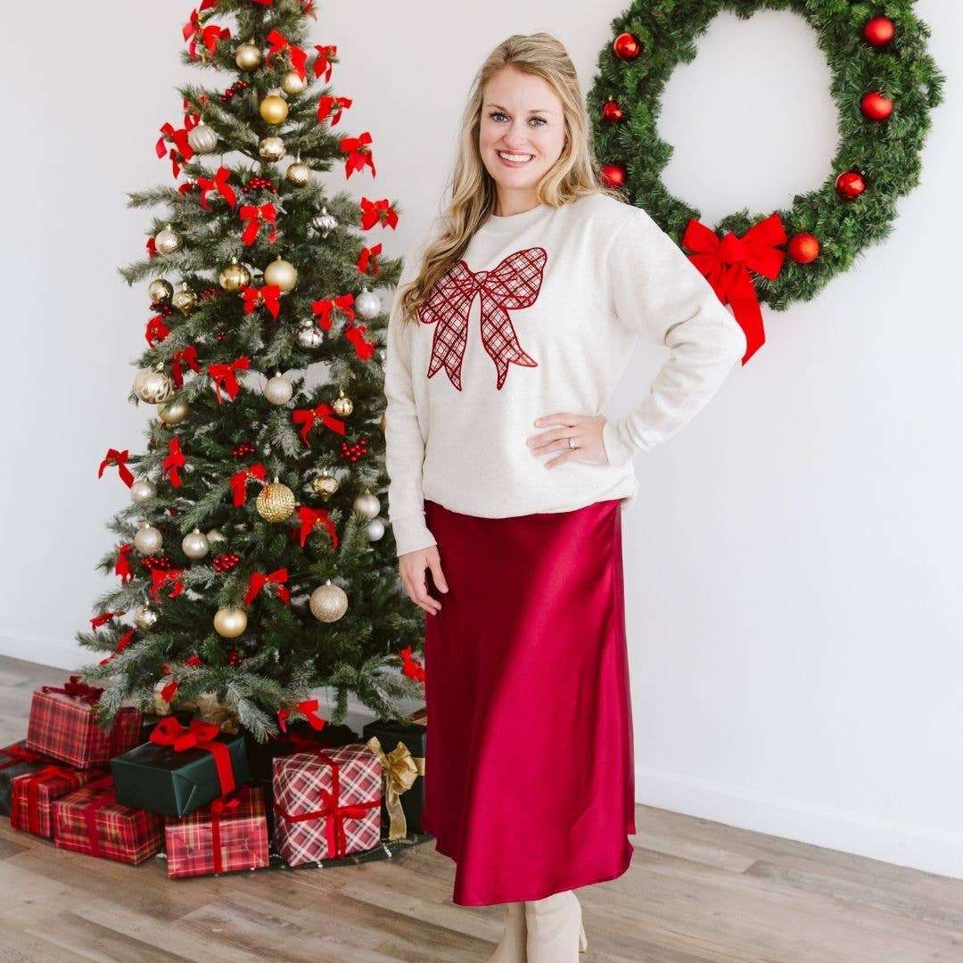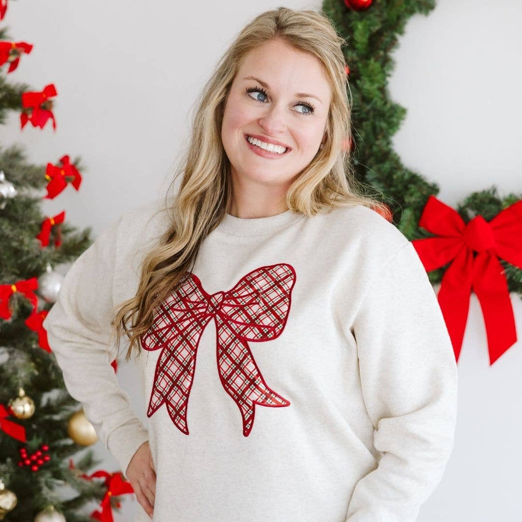 The Christmas Plaid Bow Patch Women's Sweatshirt is a fun and festive sweatshirt for women celebrating Christmas! Features: *Crewneck Color: Natural *Patch Color: Plaid pattern with a ruby red embroidered outline *Material: 55% Cotton/45% Polyester *Features: Tagless inside neck label for an itch-free wear; 3-End fleece fabric; ribbed collar; *Longer length silhouette with drop tail curved bottom hem *Fit: Ladies relaxed slightly oversized *Care: Machine washable, wash inside out, lay flat to dry, wash with like colors