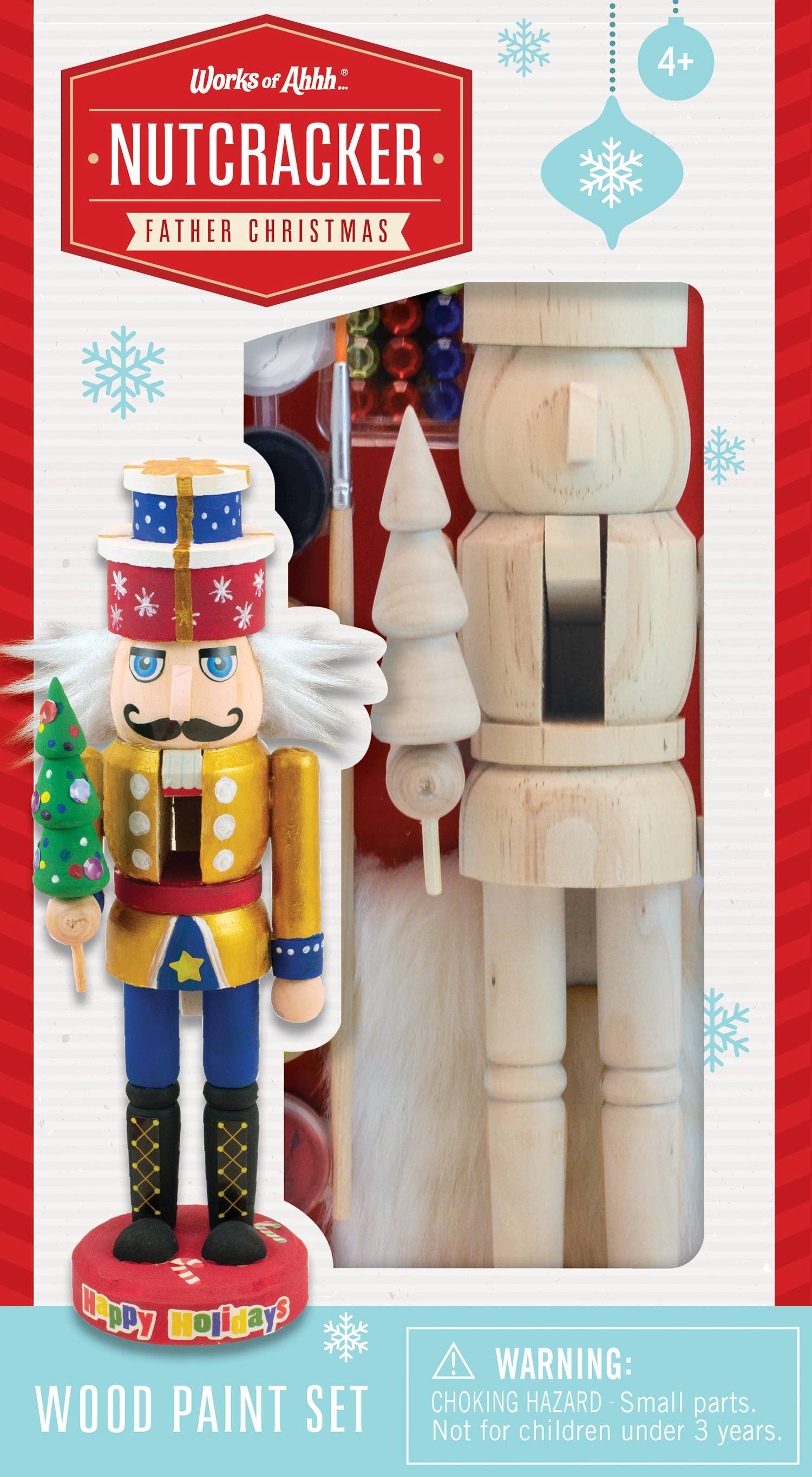 This Nutcracker Father Christmas Wood Craft & Paint Kit is made of real wood, and includes everything you need to create a beautiful work of art! The Nutcracker Father Christmas Wood Craft & Paint Kit is the perfect gift for every art loving kid! The nutcracker measures approximately 9" tall, 2.8" wide, and 2.5" deep. It includes 1 wood nutcracker Father Christmas, 12 gem stones, White fur, 1 sticker sheet, 1 non-toxic metallic finish, 5 non-toxic acrylic paint tubs, 1 flat-tipped artist-quality paintbrush, and 1 instruction sheet with painting guide.