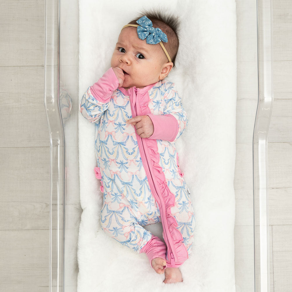 Laree + Co.'s luxuriously soft ruffle bamboo one-piece convertible footie with three-way zippers is a game changer. They make diaper changes a breeze and are also perfect for our little warriors with tubes and wires!