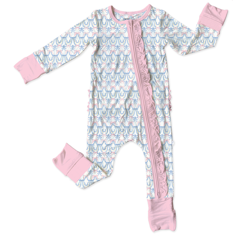 Laree + Co.'s luxuriously soft ruffle bamboo one-piece convertible footie with three-way zippers is a game changer. They make diaper changes a breeze and are also perfect for our little warriors with tubes and wires!