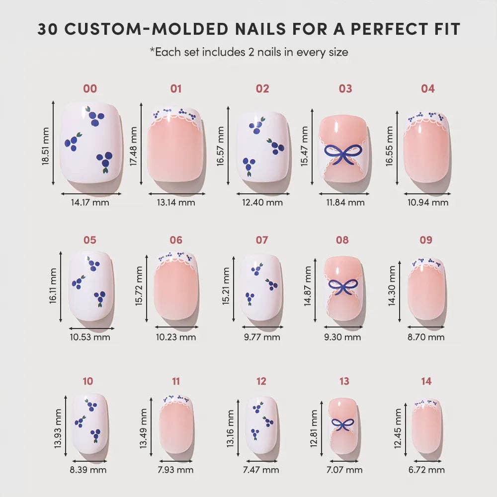Playful yet polished, Blue A Kiss seals your love with extra sweetness. This short squoval nail features varied semi-transparent and opaque designs, each adorably adorned with micro blueberry accents, demure ribbons, and scalloped lace trimmings.