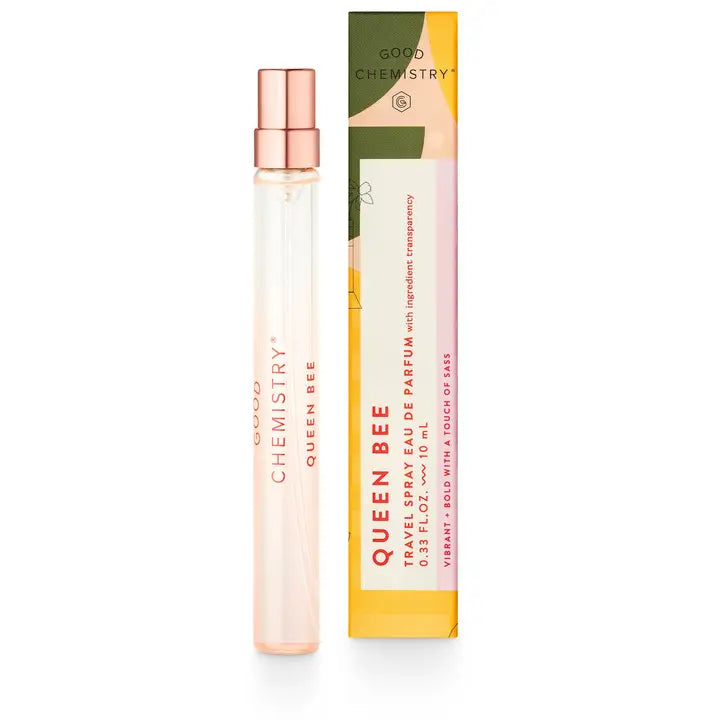 What it is A royal celebration of sparkling fruits unfolds to reveal Queen Bee's, fresh floral heart. Fragrance Notes Notes of black currant, peony, and amber make Queen Bee vibrant + bold with a touch of sass. How to Use Our travel spray allows you to take our Eau de Parfum anywhere! A precise, on-the-go option to throw in your bag for a fragrance touch-up throughout the day. Apply to pulse points--wrist, neck, and even the temples--to heighten the senses. Size 0.33 fl oz Eau de Parfum Travel Spray This skin-loving formula is packed with naturally derived ingredients, paired with a non-GMO certified, gluten-free grain-based alcohol to heighten the senses. Because it matters to us, this is vegan and cruelty-free with essential oils. We’re also really happy that it doesn’t contain phthalates, parabens, mineral oil, or propylene glycol.